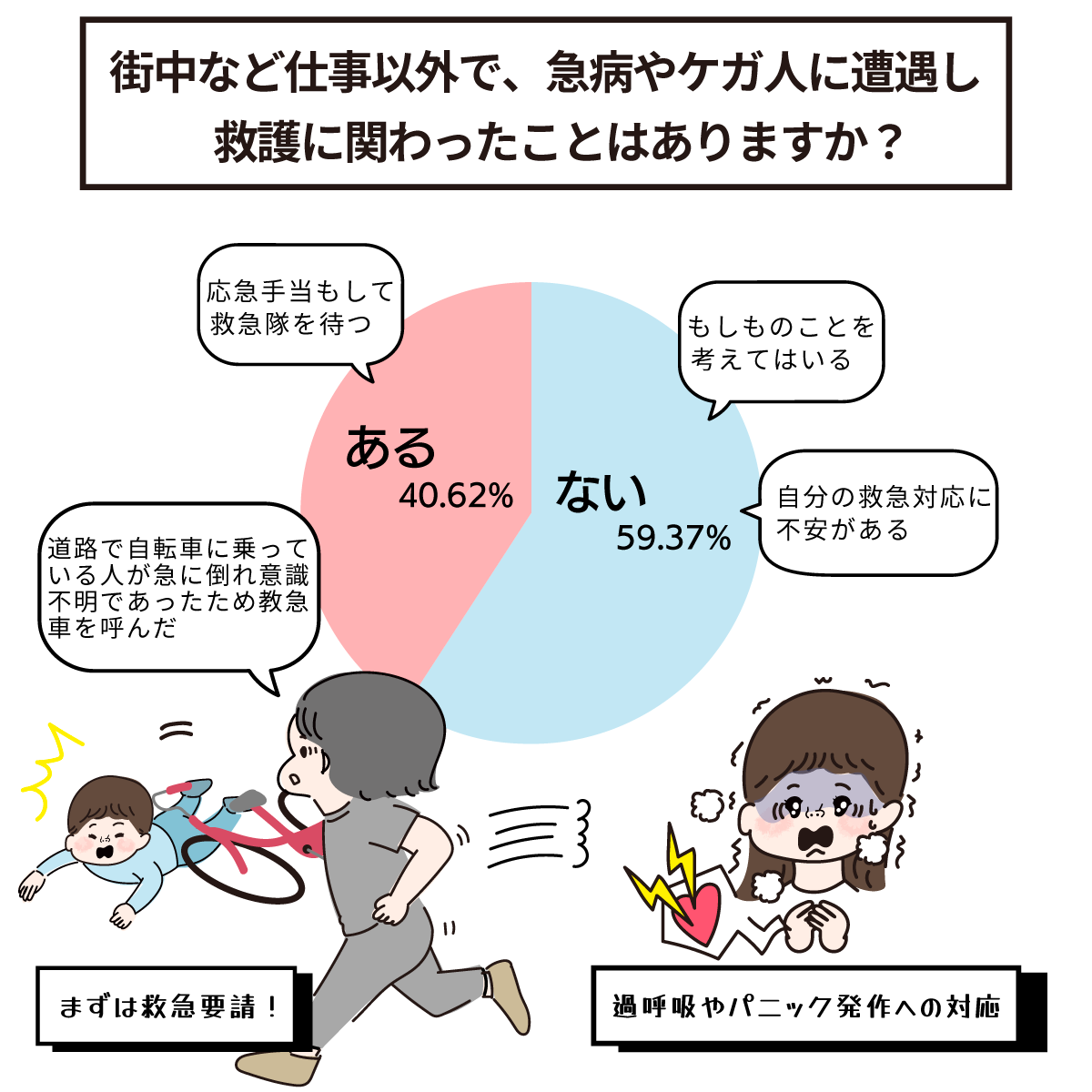 半数近い看護師が救急要請や応急手当など、一般市民の突然の救護に当たったことがあり、なんなら事故にあった被害者と加害者の間を取り持つなんてことも。