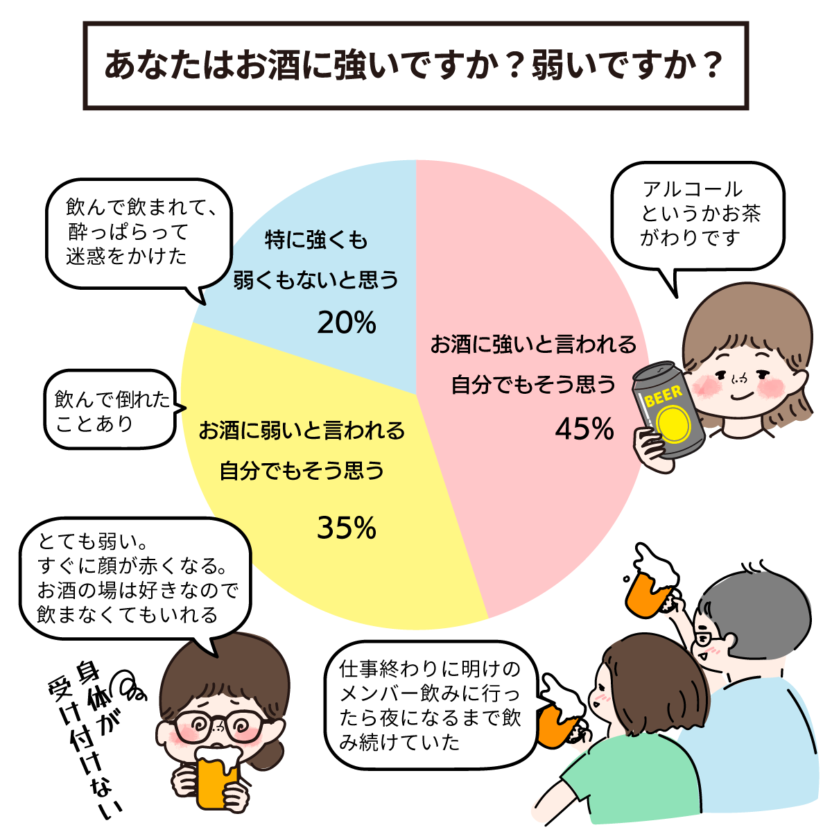とても弱い。すぐに顔が赤くなる。お酒の場は好きなので、飲まなくてもいれる。
