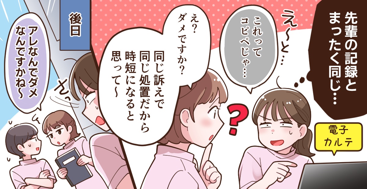 コピペに関しては問題ないと思います。記録を無駄に考え込んで時間をかけるくらいなら、患者のベッドサイドの時間を増やしてほしいと考えています。