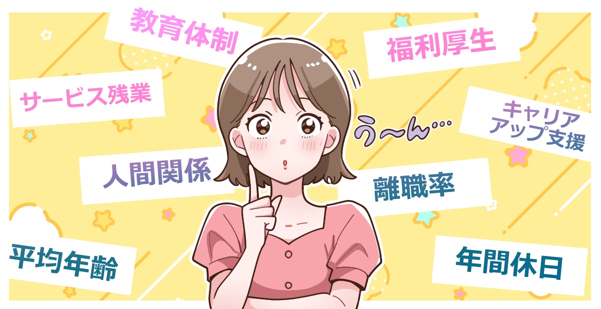 離職率、有給取得率、働いている職員の年代別の割合、残業時間数などが知りたいと思いました。