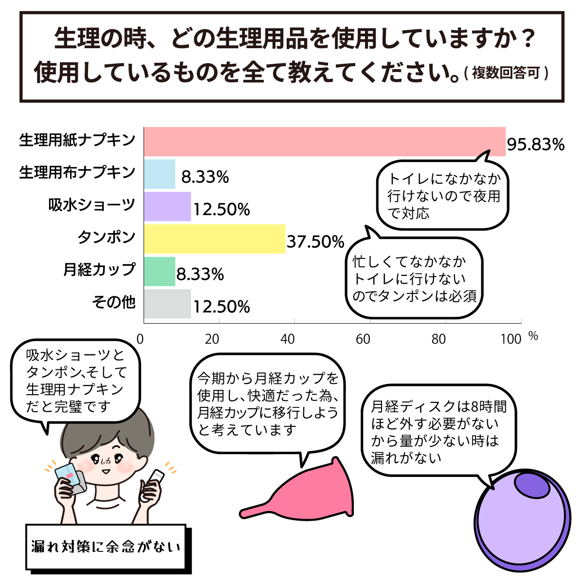 従来からある紙ナプキンやタンポンを併用しているナースが多く、やはりトイレのタイミングを逃しやすいナースにとっては漏れ防止対策は必須のよう。
