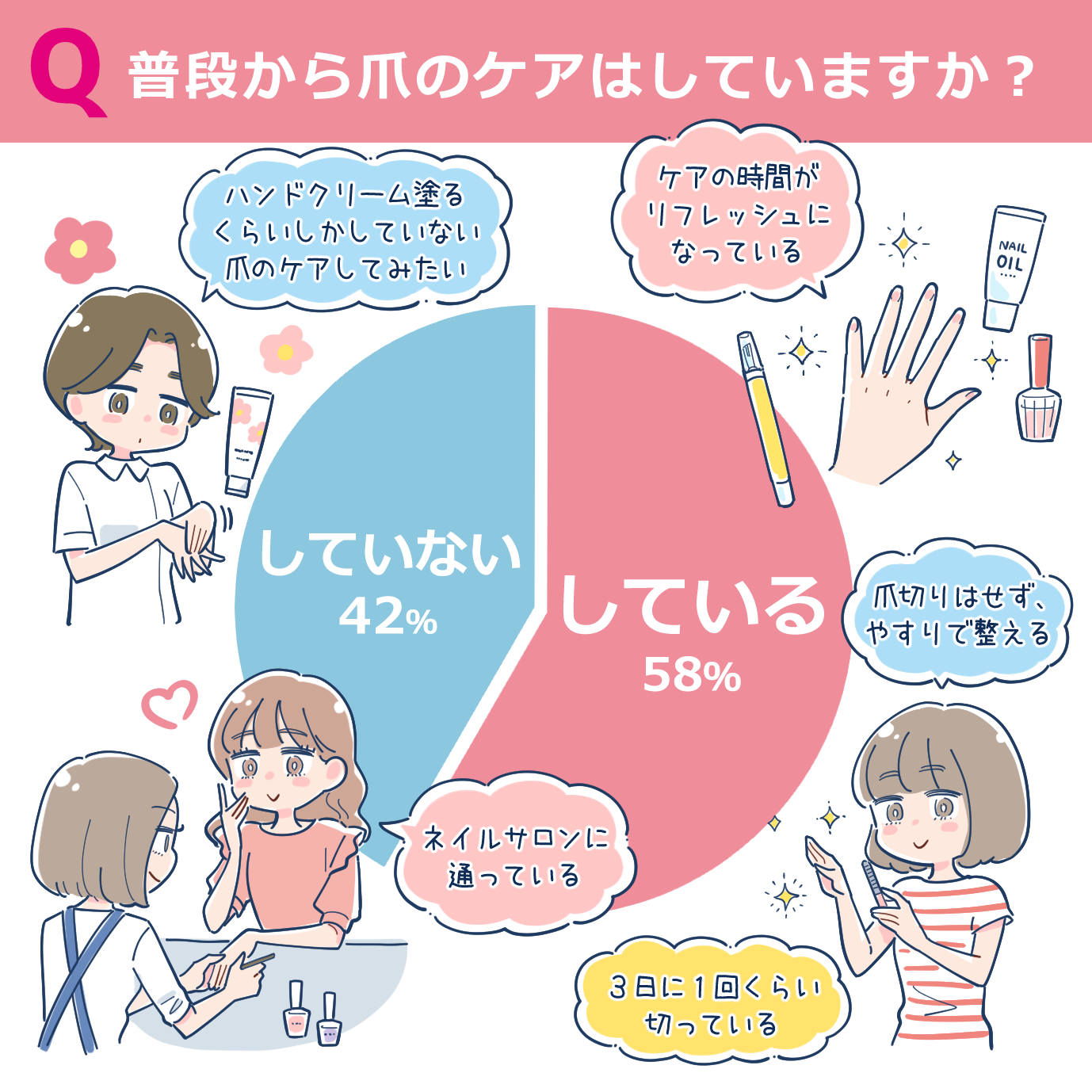 毎日のたくさん手洗いをして手を酷使しているナースですが、爪のケアをしているのは意外にも約半数のみ。
