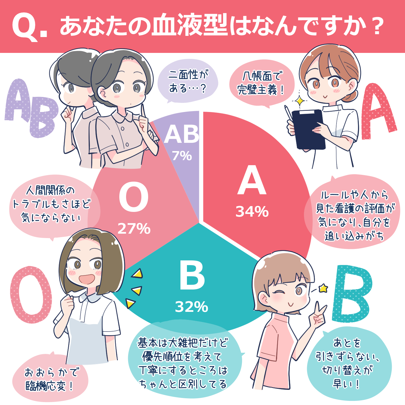 患者さんのケアや看護記録、優先順位を決めたり、上司からの指摘の捉え方まで、血液型による影響は大きいのかも。